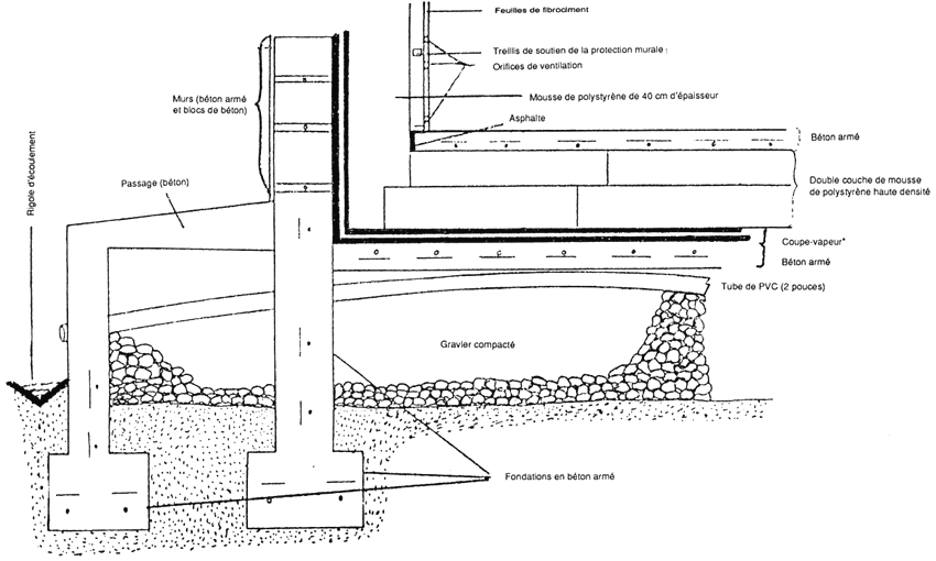 Des fondations s'élevant de 50 cm (au moins) au-dessus du sol. Des tubes en PVC de 2 pouces de diamètre, enfouis dans du gravier grossier compacté sous la chambre froide à des intervalles de 50 cm environ, assurent le drainage et la ventilation sous plancher.