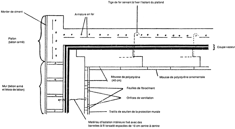 Isolation thermique: on utilise de la mousse de polystyrène ordinaire pour isoler les murs et le plafond de la chambre froide et du polystyrène haute densité pour isoler le plancher. Pour les murs et le plafond, on emploie des feuilles de 40 cm d'épaisseur (1,2 × 2,4 m) coupées de manière à ménager un chevauchement d'au moins 20 cm sur tous les côtés. Les feuilles sont maintenues en place par des fils métalliques fixés aux murs et aussi par un treillis en bois placé à l'intérieur. En ce qui concerne l'isolation du plafond, des tiges de fer recourbées sont enfoncées dans le Styrofoam (épais d'au moins 40 cm) et accrochées à l'armature du plafond. Quant au plancher, il est isolé par deux couches de Styrofoam haute densité épaisses de 20 cm, avec un chevauchement de 20 cm.