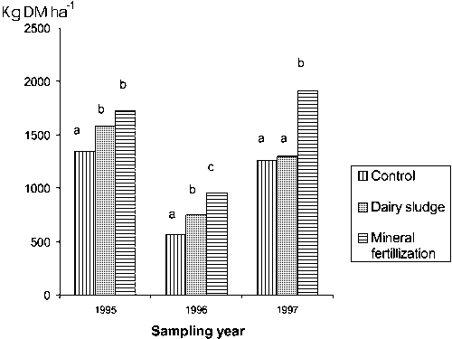 In the spring of 1995 two types of permanent grassland (Dactylis glomerata-Trifolium sp. and Lolium perenne-Trifolium sp.) were sown in Castro de Ribeiras de Lea-Lugo (NW Spain) on silvicultural systems (two kinds of plantation frame). Grassland production was compared between control (without fertilization), mineral fertilizer (500 kg ha-1 of 8-24-16 complex application per year) and dairy-plant sludge fertilizer (154 m3 ha-1, DM= 25 g -1 l). The dairy sludge application was only in the first year, 1995. In July of each year (1995, 1996, 1997) four samples were randomly taken from each plot (72 sampling plots) and dry weight was determined.