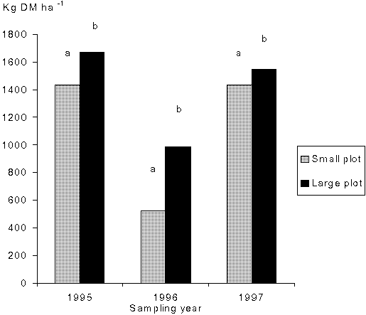 Figure 2. Forage production (kg DM ha-1) by different plot size (small plot = 64 m2 and large plot = 192 m2), (a, b: significant differences at level p< 0.01).