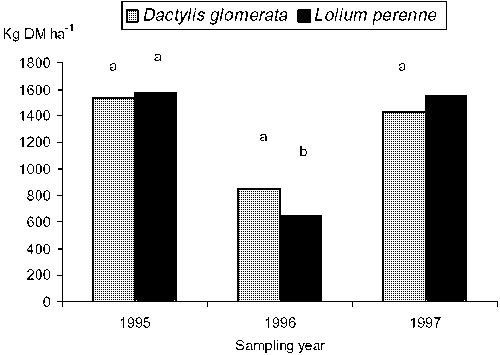 Figure 3. Forage production (kg DM ha-1) by different meadow species (Dactylis glomerata and Lolium perenne), (a, b: significant differences at level p< 0.05).