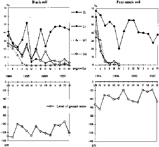 Figure 1. Maintenance of legumes in the pasture sward on black soil and peat-muck soil in the years 1994-1997.