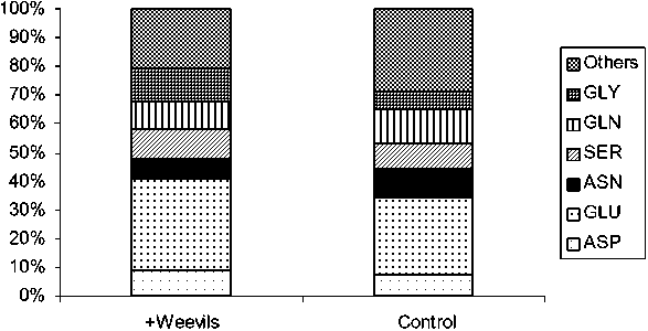 Figure 1. Relative proportions of the main amino acids found in exudates from roots of plants infested with weevil larvae, or controls.