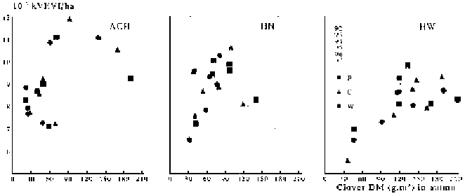 The amount of clover DM (stolons plus leaves) in autumn (Figure 2) also depicts the low clover content in mixtures with Wendy compared to that in other mixtures within 1992-1994. However, there were no significant differences in animal performance or net energy production among the mixtures within each location. No relation was found between clover content and net energy production (Figure 2).