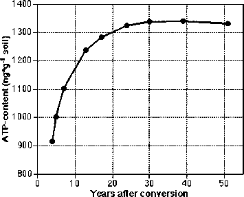 Figure 1. Interrelation between the number of years after conversion from conventional to organic farming and the ATP-content in the soil (Source: Maire et al., 1990)