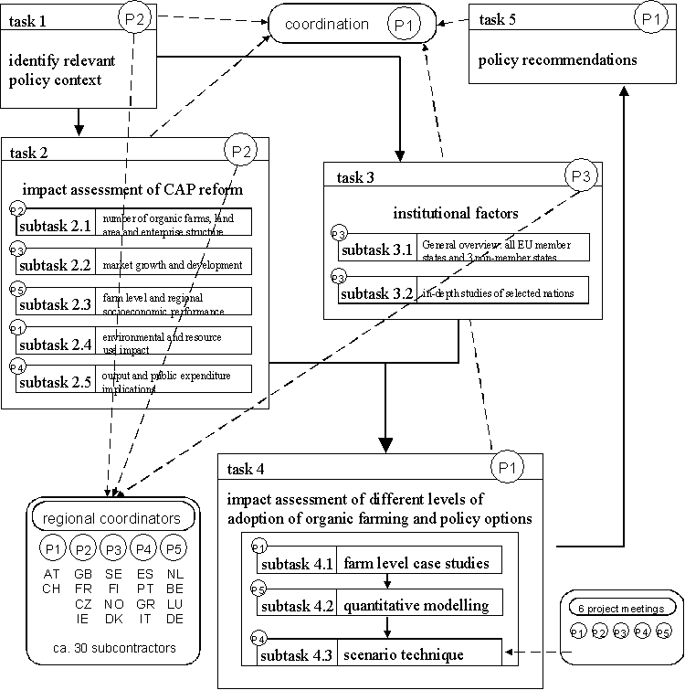 A systematic understanding of the policy and regulatory environment of agriculture as far as it is relevant to organic farming (Task 1) is a prerequisite for the whole project, specifically for the work to be carried out in Task 2. Task 3 broadens the view and seeks to explain both the development of organic farming before the recent reform came into effect and the institutional and other factors that influence the spatial and dynamically differing conversion rates beyond the policy influence. These tasks set the stage for Task 4 which aims at assessing the impact an increased adoption (at different levels) will have and on the consequences alternative policy options will have. Subtask 4.1 provides a very close-up look on selected farms in order to demonstrate likely adaptations of organic farms to a changed policy environment and to generate hypotheses for the more macro-oriented approaches, especially Subtask 4.2. This subtask will adapt and develop existing quantitative sector models in order to fulfil the objective of Task 4. Due to the inherent limitations of such a quantitative approach, Subtask 4.3 uses the scenario analysis method to integrate and evaluate the results in a semi-quantitative and qualitative fashion. Task 5 draws on all previous tasks in order to provide conclusions and policy recommendations.