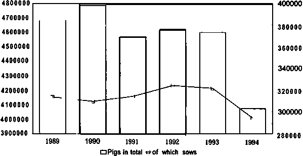Pig production is the second most important branch of animal production. As a result of the transformation process in the Czech agriculture, the number of pigs as well as of sows has decreased; in the case of pigs from 4,789 thousand to 3,862 thousand and in the case of sows from 326,000 to 293,000. Proportionally to these numbers the production of slaughter pigs has decreased and the consumption of pork per capita has fallen from 49.9 to 45.6 kg. The Czech Republic is self-sufficient in pork.