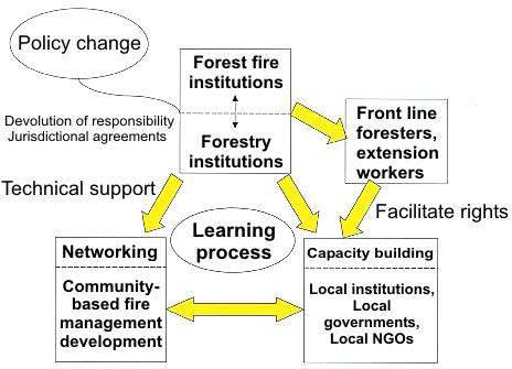 As well as avoiding the potential financial drain of concentrating solely on suppression-focused fire management strategies, a movement towards CBFiM will also help governments to resolve the very conflicts in institutional rights and authority that have inhibited forest conservation and the sustainable utilization of natural resources. The fundamental elements of institutional change needed in fire management include:
