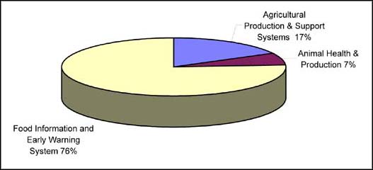 The current portfolio of pipeline projects includes 14 proposals under negotiation for a total budget of US$ 20 million. The present focus is on Agricultural Production and Support Systems (60 per cent), Food Information and Early Warning System (30 per cent), Animal Health and Production (10 per cent of the budget of pipeline projects). (See Annex 6 and Table 2).
