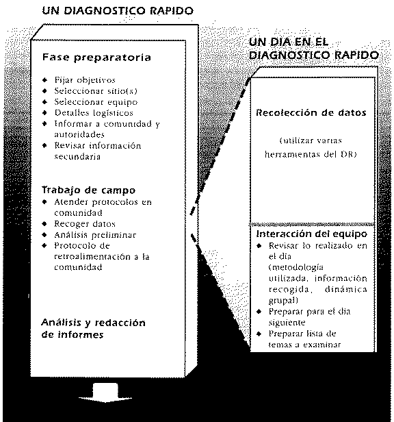 Un DR puede dividirse en tres etapas, como lo muestra la figura 1. La primera fase es preparatoria. Las actividades durante este período incluyen establecer los objetivos para el estudio, elegir el sitio y equipo de trabajo, recoger y revisar información básica, y organizar los necesarios detalles logísticos para el estudio de campo. La segunda fase del DR es el propio estudio de campo. Durante este tiempo, el equipo vive en la comunidad donde se realiza el estudio y divide su tiempo entre la recolección de información e interacción para el análisis preliminar l'ara la tercera fase del DR, el equipo se reúne para analizar detenidamente la información recolectada e idear cómo utilizarla. En el caso de un DRP -y especialmente cuando pretende elaborar un plan de acción comunitaria-, todo el análisis se realiza dentro de la comunidad, con la participación activa de la comunidad local. En el caso de un DRR, habrá un análisis inicial con la comunidad local y la información reunida se verifica y comparte con la comunidad. Pero típicamente, en un DRR al menos una parte del análisis final tiene lugar después que el equipo salga de la comunidad. En esta etapa, por ejemplo, la información recogida de varios diferentes sitios podría compararse y analizarse.