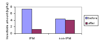 Data from all seven provinces demonstrated a sharp decline in insecticide use the season following training. There was possibly an effect on yield, which would contribute more to farm-level productivity than the reduced pesticide expenditure, but this requires further study. |
