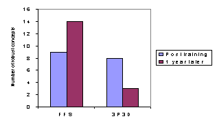 Figure A-11. Comparison between FFS and 3P3D training in the number of respondents with robust concepts immediately after training and one year later.