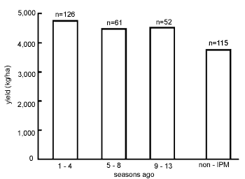 - Despite reduced spraying against the main pest, trained farmers reported 25% higher yields (from 13.7 to 17.1 t ha-1) than untrained farmers, presumably attributable to a change in agronomic practices. The quality of produce was not considered.