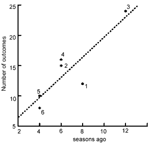 Figure A-15. Scatter plot of the number of impacts of IPM in relation to the number of seasons ago that participants followed field school training (n = 6 villages).