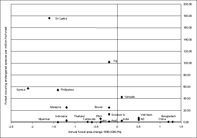 Figure 8 shows national relationships between numbers of forest-occurring endangered species per million hectares of forests, and annual change in forest area during the past decade. Not surprisingly, smaller countries with higher rates of deforestation have very high rates[17] of endangered forest species. Sri Lanka, Samoa and the Philippines are shown with high levels of endangerment, and are joined by other smaller countries such as Fiji, Vanuatu and Brunei Darussalam, with lower rates of deforestation, but where some species are naturally limited by country size. Conversely, countries with larger forest areas, such as Myanmar, Indonesia and Thailand, are able to sustain higher rates of deforestation with generally less immediate risk to overall national levels of biodiversity. However, in these larger countries, fragmentation of forest resources can pose a threat to biodiversity if forest areas become sufficiently isolated and too small to support viable populations of wildlife. Chrystanto and Justianto (2002), for example, notes: