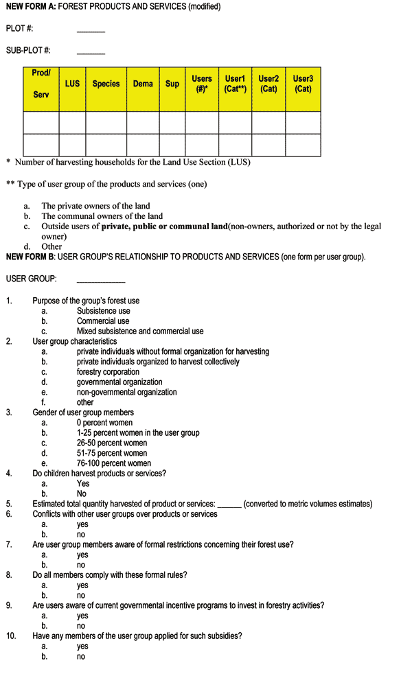 One possible way of defining user groups is to group them according to their legal rights to harvest the product or service in question. The suggested format in Table 4 below offers one possible typology for such a classification, but each country needs to agree on how to classify user groups, whether they want to differentiate according to legal rights, ethnic groups, gender, age, or perhaps family income. Once the user group has been defined, information about each group's use of products and services in a particular land use section is recorded. according to the suggested new format in Table 4. Drawing on interview information, field personnel are asked to estimate the number of harvesting households and the quantities of the harvested products and services from each land use section (LUS). New in this suggested format is also the elimination of the categories that seem superfluous to the goals of the FRA 2005, such as the as the date of the last extraction, future trees expected and future trees desired.