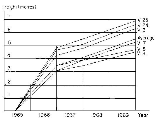 The first teak clone collection in Thailand was established by cooperation between Thai and Danish foresters in 1959, six years before the initiation of the Teak Improvement Centre (1, 11, 12). This first clone collection, consisting of 11 clones, is still being assessed annually by the centre. Apart from a successful demonstration of the possibilities of vegetative propagation of teak, the most encouraging observation concerns the two clones V 7 and V 8, selected as late and early flowering respectively (7, 12). Initial flowering in teak usually occurs from the terminal bud. Hence early flowering tends to cause irregularity in stem form, shorter clear bole and lower total height. In January 1970 the difference in average heights between the two clones, originating from the early flowering V 8 and the late flowering V 7, amounted to 2 metres (see Figure 2).
