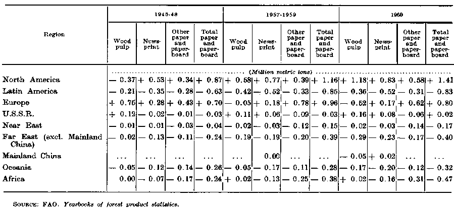 The most striking aspect of the Table is the increasing deficit position of Europe from the role of a net exporter, although in the period 1957-59 net imports were still only 5 percent of consumption. The U.S.S.R. has recovered its prewar role as the major supplier of Europe, and North American exports have in consequence declined from the level of the early postwar years. Latin America is a net exporter of a very small percentage of production (1 or 2 percent). Asian trade in sawnwood appears to be approximately in balance, while Oceania and Africa are net importers largely because of coniferous sawnwood requirements. Increasing production from coniferous plantations in south and east africa and in New Zealand is tending to reduce the net import positions, particularly in relation to total consumption.