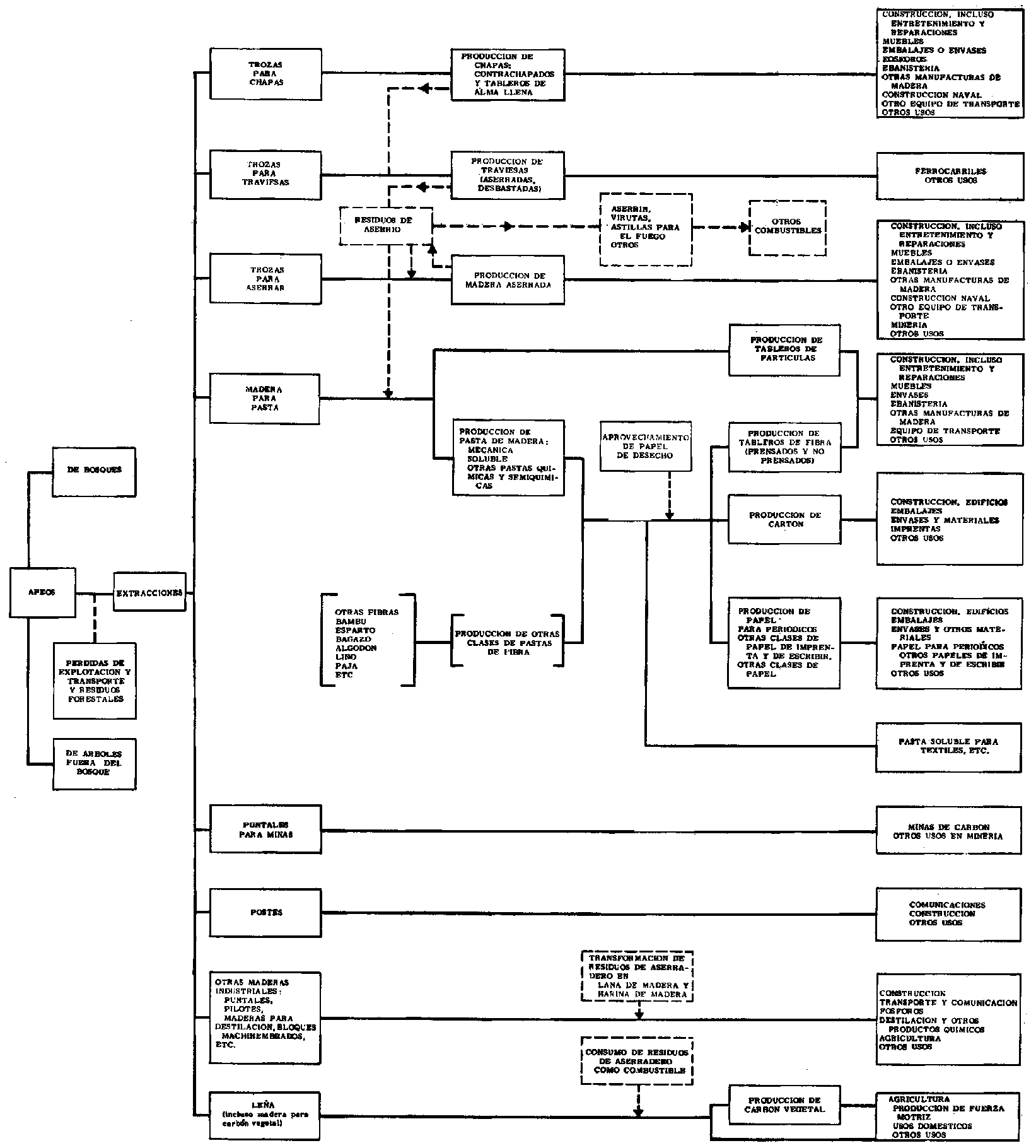 Aun cuando se decidiera pasar por alto la variedad de productos, técnicas y organizaciones económicas del sector en cuestión, se impondría, no obstante, trazar en él algunas grandes distinciones. La madera extraída de los montes puede emplearse para leña o para fines industriales; en estas páginas nos ocuparemos solamente de la madera industrial, por ser evidente que la leña presenta un interés secundario4 desde el punto de vista del desenvolvimiento industrial. La madera industrial puede destinarse a usos en que, si bien experimentando varias transformaciones, conserva intacta su estructura química y física, o bien como materia prima en procesos químicos en que, por así decir, pierde su individualidad. Tenemos, pues, por una parte, trozas transformadas en madera aserrada, que a su vez se emplea para la construcción, la construcción de barcos y los productos manufacturados; trozas para chapas, transformadas en chapas de madera, tableros contrachapados y tableros de alma llena, empleados también para la construcción y productos manufacturados; trozas transformadas en traviesas, puntales para minas, pilotes y postes. Y tenemos, por otra parte, madera para pulpa transformada en pasta por procedimientos mecánicos o químicos, y convertida luego en papel y cartón. Entre estos dos grupos ocupan una posición intermedia dos productos más recientes: los tableros de fibra y los tableros de partículas. Desde el punto de vista de la fabricación se aproximan más al segundo grupo, pero por lo que atañe a las características de la demanda deben considerarse incluidos en el primero, toda vez que tienen aplicaciones muy semejantes a las de la madera aserrada y los tableros contrachapados.