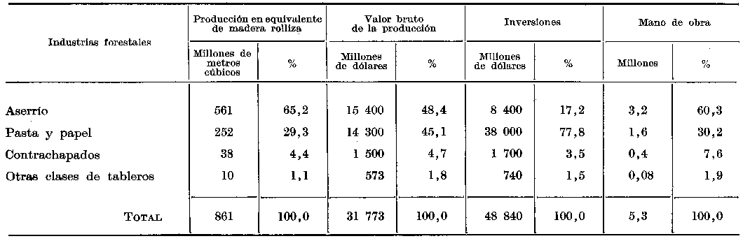 Estos dos hechos están confirmados por observaciones cuantitativas. En 1953, al sector de montes y productos forestales (incluso productos de la madera, muebles, y papel y derivados de éste) correspondió el 7,2 por ciento del valor agregado total, y el 9,25 por ciento del total de personal empleado en las industrias de la minería y fabriles de todo el mundo, situándose así en el quinto lugar entre las industrias en cuanto al valor agregado, y en el cuarto por lo que al personal empleado se refiere.6 El desglose de las dos ramas principales es el siguiente: 4,2 y 3,1 por ciento del valor agregado y 7,9 y 2,2 por ciento del personal empleado, respectivamente, por lo que se refiere a productos de la madera y muebles y a pasta, papel y derivados de éste. Esto pone de manifiesto una notable diferencia entre las dos principales ramas en productividad de la mano de obra, que es superior al promedio en el sector del papel y derivados y muy inferior al promedio en la otra rama.