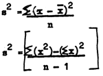 Cette formule rend les calculs plus faciles, en particulier avec une machine à calculer. Il est très important de noter ce que veulent dire les parenthèses; ∑(x²) signifie additionner toutes les valeurs de x²; (∑x)² signifie additionner toutes les valeurs de x et ensuite élever le résultat au carré. En prenant de nouveau le premier échantillon de la section 2.3.1