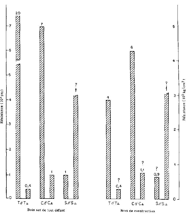 Les comparaisons de la résistance du bois de sapin Douglas en tension (T) compression (C) cisaillement (S) soit parallèlement au fil (//) soit perpendiculairement (^) montrent les extrêmes de la contribution de la nature aux propriétés du bois. La comparaison entre le bois net de défauts et le bois d'uvre couramment utilisé pour la construction montre l'effet de l'intervention de l'homme Noter que c'est essentiellement la tension parallèle au fil qui est amoindrie tandis que les autres propriétés changent très peu. Les points d'interrogation indiquent l'absence de valeurs spécifiques bien connues pour les propriétés en cause.