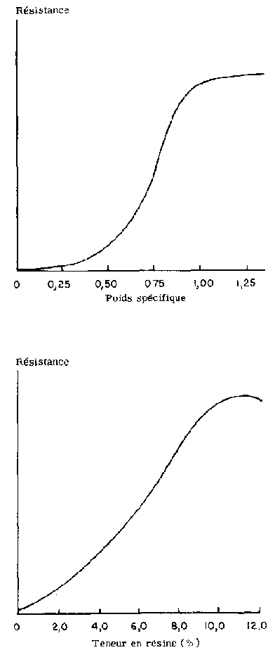 Les relations entre la résistance, d'une part, et le poids spécifique ou la teneur en résine, d'autre part, montrent l'importance de ces 2 paramètres de fabrication, qui doivent toujours être spécifiés pour définir la synthèse des matériaux dérivés du bois.