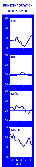 Les perspectives de la production céréalière mondiale de 2003 se sont détériorées depuis le dernier rapport, en juin, après la sécheresse généralisée et la vague de chaleur qui ont frappé l’Europe. En conséquence, il a fallut réduire fortement les prévisions de la FAO concernant la production céréalière mondiale de 2003, en indiquant que le volume qu’il faudra prélever sur les stocks mondiaux de report de céréales en 2003/04 sera nettement supérieur à ce qui était prévu auparavant, et que l’équilibre mondial entre l’offre et la demande sera beaucoup plus tendu.