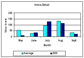 The 2003 agricultural season was characterized by erratic rainfall (started late and stopped too early with long dry spells, occasional torrential rains and hailstorms) although the total seasonal kremti rainfall was around average in most areas. In many places, including the potentially high-producing areas of Goluj sub-zoba, two or three replantings were made necessary by precipitation problems. Little or no rain in September, and sometimes as early as the second half of August, resulted in the most damage to crops. To make matters worse, some rainfall over certain areas in late October/early November wrought further damage to late-planted crops.