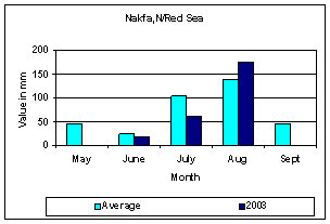 Some areas received exceptionally high rainfall during 2003. In Dekemhare, Debub zoba, rainfall from March to August amounted to 785 mm over 39 rain-days, with 282.5 and 340 mm, respectively, in July and August. However, this pattern was not repeated in the more important cropping areas such Goluj in Gash Barka, where July and August rainfall was only 78.8 mm and 69.3 mm against an average for the previous four years of 115 mm and 154.7 mm, respectively. The occasional occurrence of exceptionally heavy rainfall underlines the importance of water harvesting and of controlling the run-off from the highlands to the spate-irrigated areas in Northern Red Sea zoba.