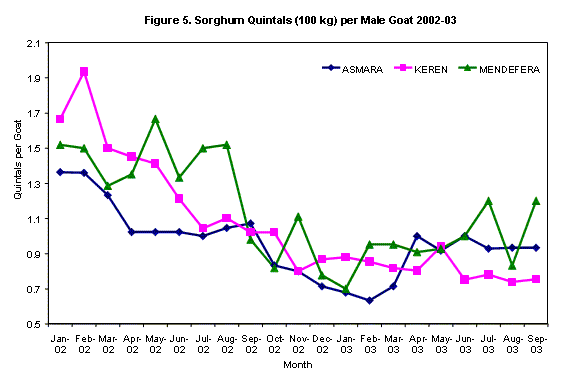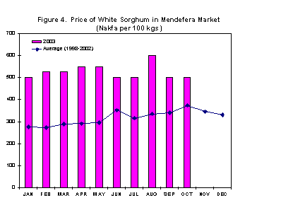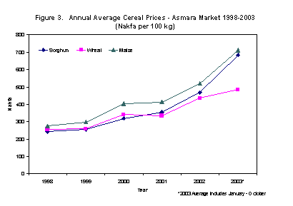 As has been the case in recent years, households in 2003 were again faced with rising prices for major staples. Between 2002 and 2003, the average price for white sorghum in Asmara, Keren and Mendefera, rose by 46 percent, 50 percent and 37 percent respectively. This followed cereal price increases of up to 50 percent in some markets in 2002.