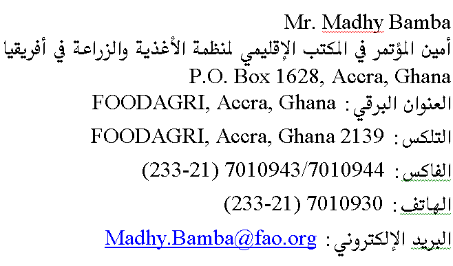 ملحوظة: يرجى أن يقوم كل مشارك بملء هذه الاستمارة من أصل وصورة وأن يرسل نسخة واحدة إلى كل من العنوانين التاليين في أقرب وقت ممكن، ومن الأفضل أن يكون ذلك قبل شهر من موعد انعقاد المؤتمر، حتى وإن لم تستوف البيانات الخاصة بتاريخ السفر ورقم الرحلة. ويمكن إرسال البيانات الناقصة برقيا أو بالفاكس أو البريد الإلكتروني في موعد لاحق. | ||