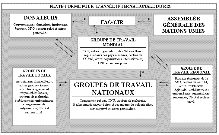 37. Pour atteindre ces objectifs, l'Année internationale du riz s'appuiera sur une démarche participative, consultative, novatrice et dynamique qui tiendra compte des compétences et aptitudes de l'ensemble des intervenants concernés, tous niveaux confondus. Afin de faciliter la mise en œuvre simultanée des activités menées aux niveaux mondial, régional, national et local, il a été décidé d'assortir l'Année internationale du riz d'un plan de mise en œuvre. En tant qu'organisation nommée dirigeante de la conduite des activités relevant de l'Année internationale du riz, la FAO a constitué une Unité de coordination et de mise en œuvre de l'Année internationale du riz qui a pour tâche d'appuyer la coordination des activités entreprises au titre de cette manifestation, à tous les niveaux d'intervention, dans le cadre du plan de mise en œuvre. À l'échelle mondiale, la coordination des activités a été confiée à un Groupe de travail informel international, créé lors de la réunion informelle internationale de planification et de coordination de l'Année internationale du riz. La gestion au quotidien des activités incombera au Secrétariat de la Commission internationale du riz, qu'accueille le service des cultures et des herbages de la FAO. Le plan de mise en œuvre de l'Année internationale du riz, depuis le niveau mondial jusqu'au niveau local, est indiqué à la Figure 1
