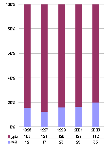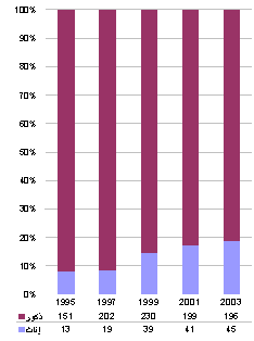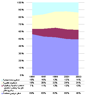 3- وتتضمن الأشكال والجداول من 4 إلى 9 إحصائيات أوضاع التوظيف خلال الفترة 1995 إلى 2003. وتشير بيانات التوظيف إلى عقود الموظفين المحددة المدة أو المستديمة.