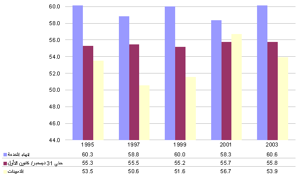 8- ويبين الشكل/ الجدول 8 أن متوسط عمر الموظفين قد ظل ثابتا عند مستوى عال خلال الفترة 1995 إلى 2003.