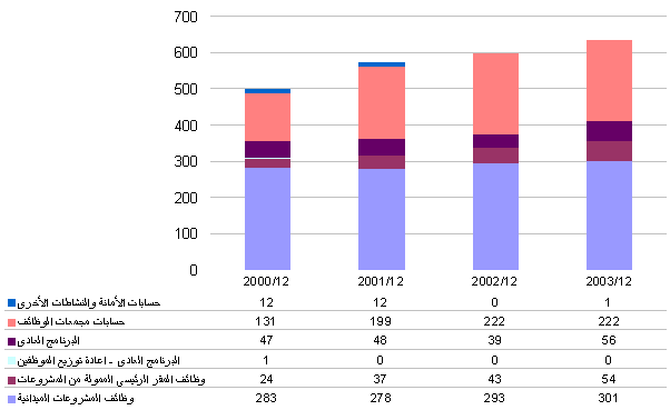 2- يقدم الشكل/ الجدول 2 معلومات عن الوظائف التي تزيد مدتها عن سنة واحدة والتي أنشئت خارج برنامج العمل والميزانية. ومعظم هذه الوظائف خاصة بالمشروعات الميدانية والموظفين الفنيين المزاملين. ويظل إجمالي عدد وظائف المشروعات المالية في تراجع بتخفيض 34 من الوظائف الفنية وزيادة طفيفة قدرها 18 من وظائف فئة الخدمات العامة. وزاد عدد وظائف المشروعات في المقر الرئيسي بأكثر من الضعف، من 68 وظيفة في ديسمبر/كانون الأول 2000 إلى 145 وظيفة في ديسمبر/كانون الأول 2003.