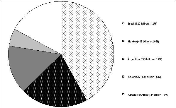 Table 1 illustrates the distribution of income in the region in 1997. Brazil has the largest income at just under US$ 840 billion (or 42% of the total for the region). Other countries with large economies in the region include: Mexico (with US$ 403 billion or 21%), Argentina (US$293 billion or 15%) and Colombia (US$ 109 billion or 6%). Together, these four countries account for just less than 84 % of the total income in the region.