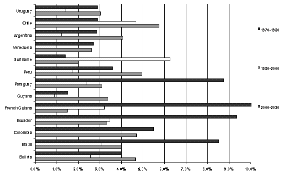 Figure 10 Historical and projected average annual growth in real GDP from 1970 to 2020-South America