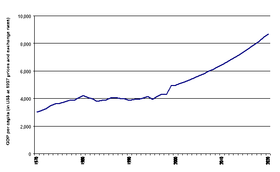 The development of GDP per capita from 1970 to 2000 and the projections to 2020 are shown in Figure 11. The income categories used here are slightly different to those presented earlier, but the table shows that currently more than a half of the countries in Latin America have per capita incomes of more than US$ 2 500 per year.
