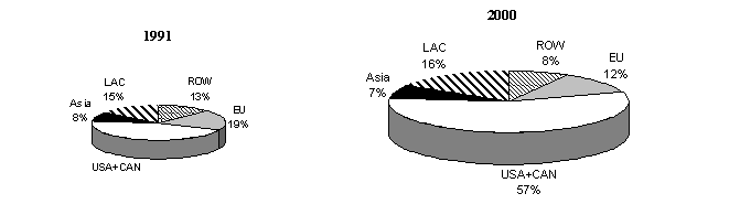 Subsidies applied to agriculture by the United States have a direct impact on exports of the FTAA countries and also a delay on multilateral negotiations of agricultural products. (CEPAL/ECLAC. Baumann, 2002). One of the major impacts of US subsidies on agriculture e.g. through preferential loan agreements and tariff-rate quotas on sugar (Groombridge, 2001) is that as they lower the prices of commodities, they lower farmer’s incomes in developing countries and therefore their “willingness to invest” in agriculture. To make agriculture profitable in the short term, they need to use extensive practices, i.e. forest clearing by slash-and-burn. EU subsidies through the Europe’s Common Agriculture Policy (CAP) which favours EU farmers, is seen as many LA countries as a major obstacle for some of their most competitive agricultural products. (IDB, 2002). Colombia applies “industrial” subsidies to exports and has been allowed by the OMC to keep them until 2006 (CAN, 2002). America’s subsidies to its soya farmers hurt Brazil and Argentina. Many other Latin American farm exports, such as sugar, cotton or orange juice, are politically sensitive in the United Stated. What is worse is that the United States is already trying to wriggle out of an agreement made with Mexico under the North American Free Trade Agreement that allows unrestricted sugar imports by 2008. (The Economist, 2002).