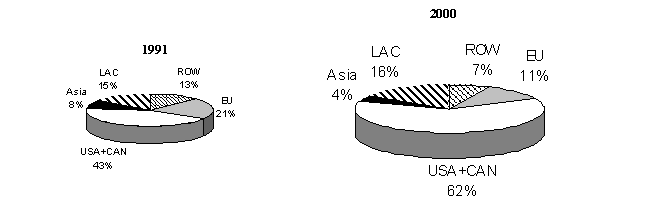 North South agreements (Table 12 ) have a direct relation with the increase of trade. For example, between 1991 and 2000 trade increased from US$ 22.7 billion to US$ 36.3 billion between EU and MERCOSUR. Similarly, EU exports to MERCOSUR increased from US$ 7.9 billion to US$ 19 billion and MERCOSUR exports to EU from US$ 14.8 billion to USD $ 17.3 billion. The NAFTA has also had a major impact for the second main economy of Latin America, Mexico. However, North-South agreements could not produce important advances in the regional negotiations if they are not significant changes in the multilateral side e.g. respect to subsidies and agriculture protectionism or antidumping measures. (CEPAL/ECLAC. Baumann, 2002).