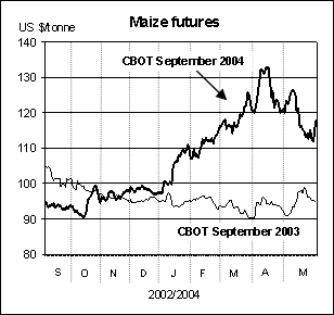 The outbreak of the avian influenza in Asia, combined with rising freight rates, reduced feed grain purchases and applied downward pressure on prices. At the same time, reduced sales from China, strong demand in the United States, and a tight feed market in Europe have had an opposite effect. Coarse grains prices during this time of year are most sensitive to the weather situation and the size and condition of the new crop in the United States. Maize prices moved within a US$124-138 per tonne range since March but began to weaken more consistently only in recent weeks as prospects for new crops began to improve. In May, the export price of US maize (US No.2 Yellow) averaged US$130 per tonne, as much as US$22 per tonne, or 20 percent, above the corresponding month last year. Influenced by favourable planting conditions, weaker soybeans and smaller trade prospects for the next season, the Chicago maize futures fell sharply in May. By the fourth week of the month, September futures stood at around US$118 per tonne, some US$5 per tonne below the values quoted in March. Production in 2004 is currently forecast to increase, and supplies among major exporters have improved, but a recovery in Asia and lower exportable supplies in China and Brazil could keep prices firm into 2004/05.
