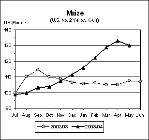 The outbreak of the avian influenza in Asia, combined with rising freight rates, reduced feed grain purchases and applied downward pressure on prices. At the same time, reduced sales from China, strong demand in the United States, and a tight feed market in Europe have had an opposite effect. Coarse grains prices during this time of year are most sensitive to the weather situation and the size and condition of the new crop in the United States. Maize prices moved within a US$124-138 per tonne range since March but began to weaken more consistently only in recent weeks as prospects for new crops began to improve. In May, the export price of US maize (US No.2 Yellow) averaged US$130 per tonne, as much as US$22 per tonne, or 20 percent, above the corresponding month last year. Influenced by favourable planting conditions, weaker soybeans and smaller trade prospects for the next season, the Chicago maize futures fell sharply in May. By the fourth week of the month, September futures stood at around US$118 per tonne, some US$5 per tonne below the values quoted in March. Production in 2004 is currently forecast to increase, and supplies among major exporters have improved, but a recovery in Asia and lower exportable supplies in China and Brazil could keep prices firm into 2004/05.