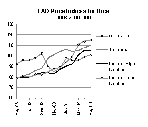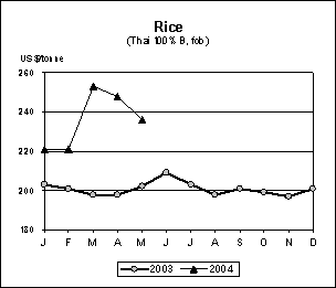 International rice prices have strengthened since December 2003, with the FAO All Rice Price Index (1998-2000=100) topping the 100 point threshold in March, for the first time since September 1999. The rise in the first 5 months of the year has been most pronounced for low and high quality Indica rice, major exporters such as India and Myanmar being absent from the market. In May, however, firmness in prices was tempered by the release of rice from government inventories in Thailand and China, which have, respectively, contributed to a rise in export supplies and a drop of import demand. As a result, high quality Thai 100% B rice was quoted at US$236 per tonne in May, US$12 per tonne less than in April. In the coming months, prospects for world prices are still positive overall, with additional strength stemming from the surge of crude oil prices, the resulting rise in costs being passed along. Currently, however, the pressure for prices to rise appears to be slacking, especially after China gave clear signs that the country still has enough supplies to keep imports within reasonable bounds.