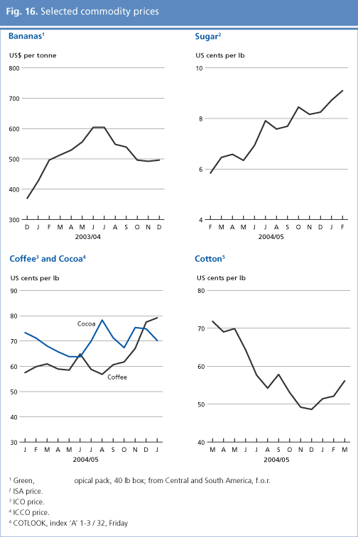 Other relevant agricultural commoditiesForty three developing countries depend on exports of a single agricultural commodity for more than 20 percent of their total revenues from merchandise exports. Most of them suffer from widespread poverty, with more than three-quarters classified as least developed countries. Most common among the commodities they depend on are coffee, cocoa, cotton, sugar and bananas1/. For non oil-exporting countries, agricultural exports represent the mainstay of foreign exchange earnings. Nearly all of Malawi’s agricultural exports, for example, come from tobacco and tea. Benin depends on cotton for over 80 percent of its merchandise export earnings. Ethiopia relies on coffee for over 70 percent of agricultural exports. Cuba’s agricultural exports are about one-third from sugar, while bananas make up 30 percent of Ecuador’s agricultural export earnings. The following section of Food Outlook provides a brief overview of price trends and other developments for these commodities.