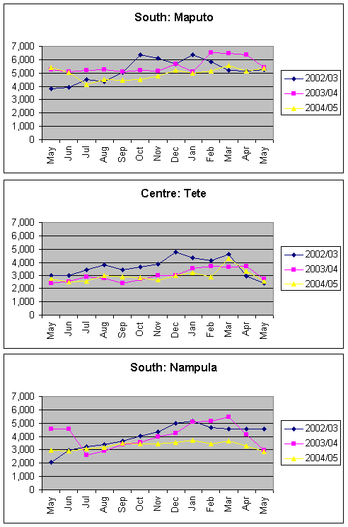 Last year’s exceptional maize harvest in the southern provinces was not repeated this year as the continuous rains from January to April in 2004 that prompted widespread maize planting were not repeated. However, in the north, although the rains were not as well distributed as in 2004, they were heavier and more than adequate to support slightly improved maize production from a slightly increased area. In the central region, where cereal production varied from above to below last year according to location and crop, an earlier start to the rains finished early after a season characterised by heavy rains and dry spells.