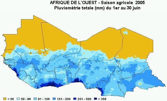 Source des données : NOAA, FAO - - Préparé par : FAO/SDRN, Groupe Agrométéorologie Voici le second rapport du SMIAR sur les conditions météorologiques et l'état des cultures dans les pays sahéliens de l'Afrique de l'Ouest en 2005. L'aire géographique couverte par ces rapports comprend les neuf pays membres du Comité permanent inter-Etats de lutte contre la sécheresse dans le Sahel (CILSS), à savoir Burkina Faso, Cap-Vert, Gambie, Guinée-Bissau, Mali, Mauritanie, Niger, Sénégal et Tchad. Ces rapports seront établis tous les mois de juin à novembre. Le rapport final pour l’année 2005, contenant les premières estimations de production, sera publié fin novembre. Ces rapports sont établis en utilisant des données fournies par les représentations de la FAO dans les pays, le Groupe agrométéorologique et Groupe de surveillance de l'environnement (SDRN), le Groupe acridiens, migrateurs nuisibles et opérations d'urgence (ECLO), le Service des opérations d’urgence (TCEO), le Programme alimentaire mondial (PAM), ainsi que diverses organisations non gouvernementales (ONG). Pour le présent rapport ont été utilisés les données pluviométriques locales, l’imagerie satellitaire fournie par FAO/ARTEMIS, les rapports de terrain et informations communiquées par les représentants de la FAO jusqu'au 30 juin. Les images satellites de la première décade de juin ont été également analysées pour une dernière mise à jour.
