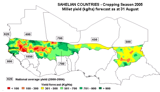 The map below shows the forecasted yield of millet for the Sahelian countries for the 2005 cropping season. The map is obtained by applying to each country a function which relates, in a statistical way for the period 1984 to 2004, the output parameters from the FAO crop specific water balance model to the crop yield. For 2005, the water balance model is using average rainfall from 1st September to the end of the crop cycle.