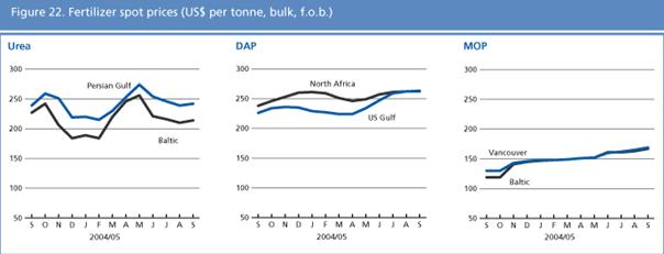 Prices of MOP have also remained largely unchanged in the past few months, but are 30 to 40 percent higher than at the same time last year. There is a big gap between the lowest and the highest price quoted. There is a possibility that the EU commission may allow a quota of MOP from the Russian Federation to be sold without antidumping duty in all of the 25 member countries. Shipments to India continue to be substantial, with the main supplier being Israel. The total amount imported between April and July 2005 has increased by about 20 percent compared to last year to almost 1 million tonnes. Chinese imports also increased by 20 percent in the period from January to June, compared to the previous year, to 4.5 million tonnes. The Southeast Asian market is currently slow. The Brazilian market is weak as well because stocks are high both at the ports and inland.