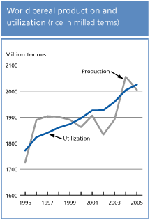 HIGHLIGHTSFAO latest forecast for the 2005 world cereal output has been raised considerably since the September report to 2 005 million tonnes, 2.4 percent lower than last year’s record crop. Cereal crops have been satisfactory in most regions, except parts of Africa and South America. Planting of the 2006 cereal crop is underway in the main producing regions under generally favourable conditions so far. However, prospects are uncertain in Southern Africa and South America. Global cereal utilization is forecast to rise in 2005/06, with an expected increase in food consumption leading to some gains in the average per capita consumption in developing countries. By contrast, feed use of cereals is expected to decline. World cereal stocks are forecast to decrease, mostly reflecting smaller coarse grains inventory as a result of lower production this year. Cereal trade is expected to contract in 2005/06 following improved production in several major importing countries, mainly in Asia. International prices of cereals are generally higher than a year ago. Export prices have increased sharply in Argentina, reflecting reduced wheat production, and in South Africa as a result of high regional demand for maize. World milk output is expected to grow in 2005, but supplies from traditional exporters remain tight. International trade prices have stabilized at high levels supported by firm demand, particularly in Asia and North Africa. International prices of oilseeds have weakened in recent months following a substantial increase in production in 2004/05 (October/September), which has resulted in record oilseed carryover stocks. Global sugar production is forecast to rise in 2005 but sustained demand in developing countries will likely keep the global supply tight. International sugar prices remain firm. International banana prices have increased reflecting the impact of adverse weather in Latin America. In late November, the EU adopted a tariff-only system for banana imports due to start in January 2006. Any further extensive spread of avian flu could seriously disrupt global poultry and feed markets.